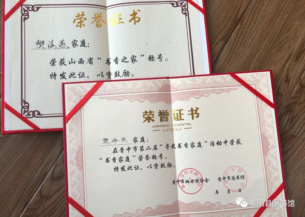 2020年12月5日,晋中市第二届寻找“书香家庭”揭晓。这次寻找“书香家庭”活动由晋中市图书馆承办,从全市60多组家庭中择优选择符合标准的30组家庭,在晋中市图书馆微信公众号中予以公示,无异议后将参与网络投票,从中选出20组家庭参与下一阶段竞选。之后对20组家庭进行线下交流,实地考察无异议后,最终确定了15组家庭为“书香家庭”。由寿阳县图书馆、县妇联选送的樊海燕“书香之家”,经过网络投票、线下竞选、实地考察、公示无异议后,和全市共15组家庭荣获“书香家庭”荣誉称号。
